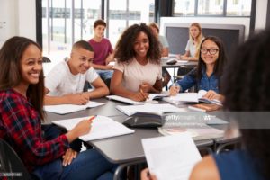 High school kids looking to teacher sitting at their desk
